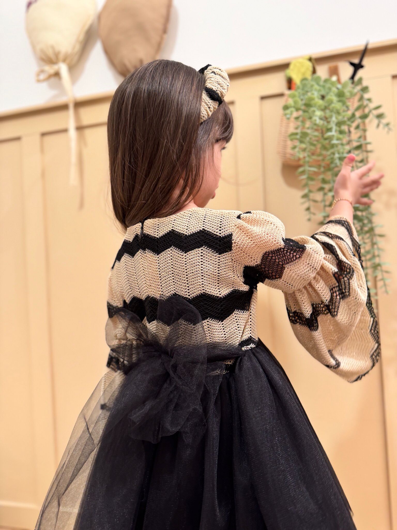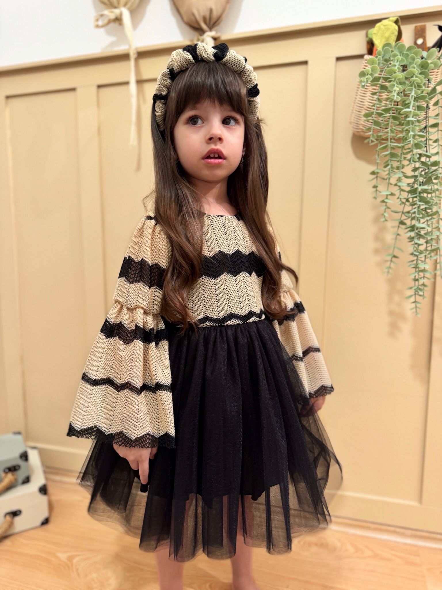 Küçük prensesiniz için tasarlanmış bu siyah ekru renkli örme triko üstü, siyah tüllü eteği ile bir araya gelen bir kombinasyon sunuyor. Modern tasarımı ve zarif detaylarıyla dikkat çeken bu elbise, özel günlerde ve günlük kullanımda kızınızın tarzını tamamlayacak.
